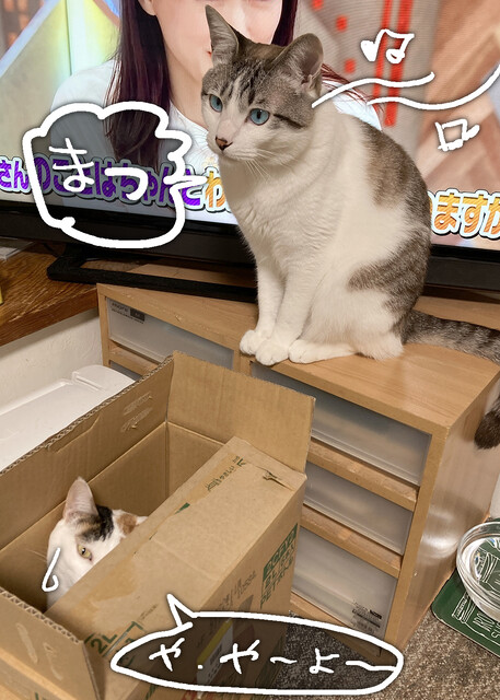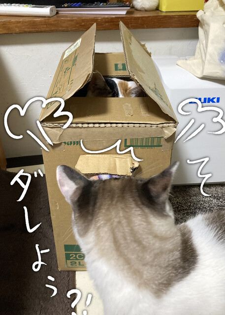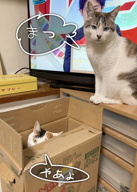 猫って待つの得意だよね 2022年04月14日 22:14 段ボールの前を通り過ぎるカブ吉。 気がつくカブ吉。いますね。いますよ。あなた以外で、段ボールに入るひとはまあ大体決まってるとおもう。びわねねは、この段ボールがお気に入り。おかげで、いつまで経っても捨てられない。段ボールに入りたいカブ吉。ねねの場所が何でもどこでも羨ましいカブ吉。でも、ねねはまだ出ないってよ。待つのね。いつまでも待つのね。猫って忍耐強いよね?待つよね。カブもびわが飽きて出るまで待つ。いつも。それから順番が来ると入る。ちょっとだけ。一人で入っても、そんなには楽しくないらしい。いつもコメントありがと!りるさん、過去リンクも見てくれてありがと!絡まるよね。全員。ぼたん雪さん、そう?そうだった?びわが一番俊敏だから?かな? < 前の記事次の記事 > コメント コメントフォーム 名前 コメント 記事の評価 リセット リセット 顔 星 情報を記憶 コメントを投稿する