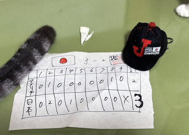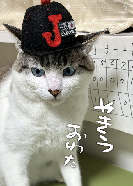 ちゃんピオん、おめでとう! 2023年03月22日 23:02 面白かったあ・・・・。面白かったねぇWBC!超にわかなので、村上宗隆くんのお顔も、今回覚えたよ。タッコママは、佐々木朗希推しになってた。ウチのムネムネ君。ミチの作るスコアボード、びんぼクサくて好き。そんなにキライでしたか。すまん。びわちゃんもかぶってね。お祝いだからね。おやすみおやすみ。明日からWBCないの、さみしいねぇ。皆様コメントありがと〜〜〜!ろきさん、嬉しいねぇ。楽しかったねぇ。#suzuri #suzuriで販売中 タグ :#SUZURI#犬猫撮影#WBC#村上宗隆 < 前の記事次の記事 > コメント コメント一覧 (1) 1. ろき 2023年03月23日 12:11 高校野球も楽しいから見てね。 0 piobi がしました コメントフォーム 名前 コメント 記事の評価 リセット リセット 顔 星 情報を記憶 コメントを投稿する