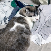 洗濯物をさ、取り入れてさ、ちょっと、ふわっと、置いておくとさ、乗るよね。猫。わざわざ乗って寝るよね。猫は、洗濯したての衣類が大好きだよね。知ってた・・・。 コメントありがとありがとう!明日は雨降るの?ホントぉ?またポチッとしてくれてありがとね!#suzuri #s ...